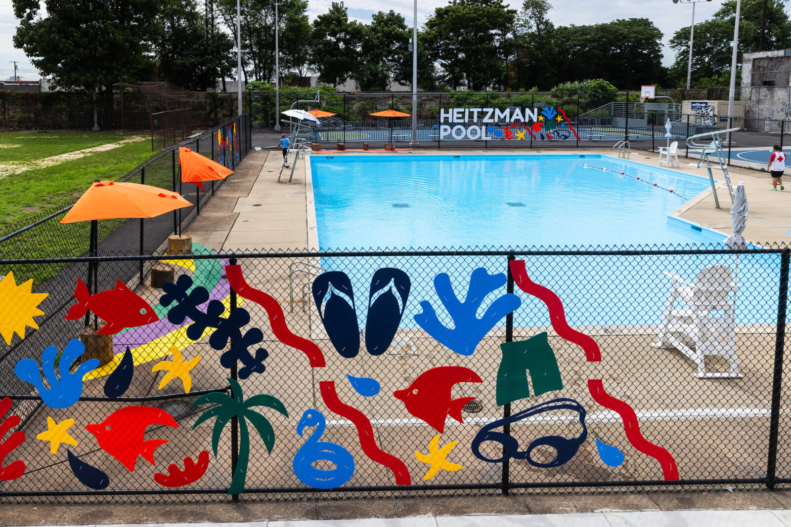 • SwimPhilly: Heitzman Rec © 2023 City of Philadelphia Mural Arts Program / NDA, Heitzman Recreation Center, 3631 Amber Street, Photo by Steve Weinik.