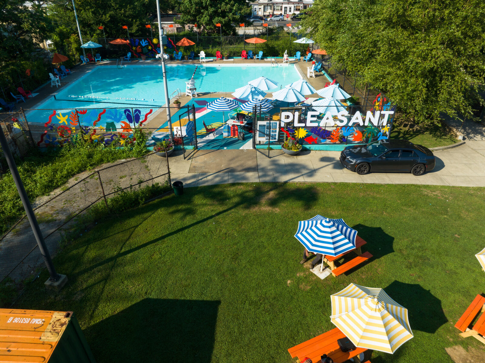 • SwimPhilly: Pleasant Playground © 2023 City of Philadelphia Mural Arts Program / Calo Rosa, Pleasant Playground 6757 Chew Ave. Photo by Steve Weinik.