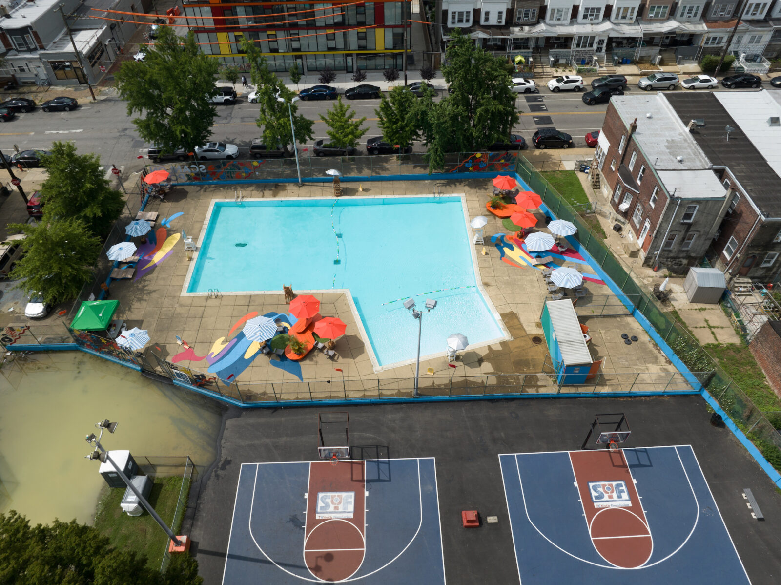 • Swimphilly: Christy Recreation Center © 2023 City of Philadelphia Mural Arts Program / Gabe Tiberino, Christy Recreation Center, 56th & Christian Streets. Photo by Steve Weinik.