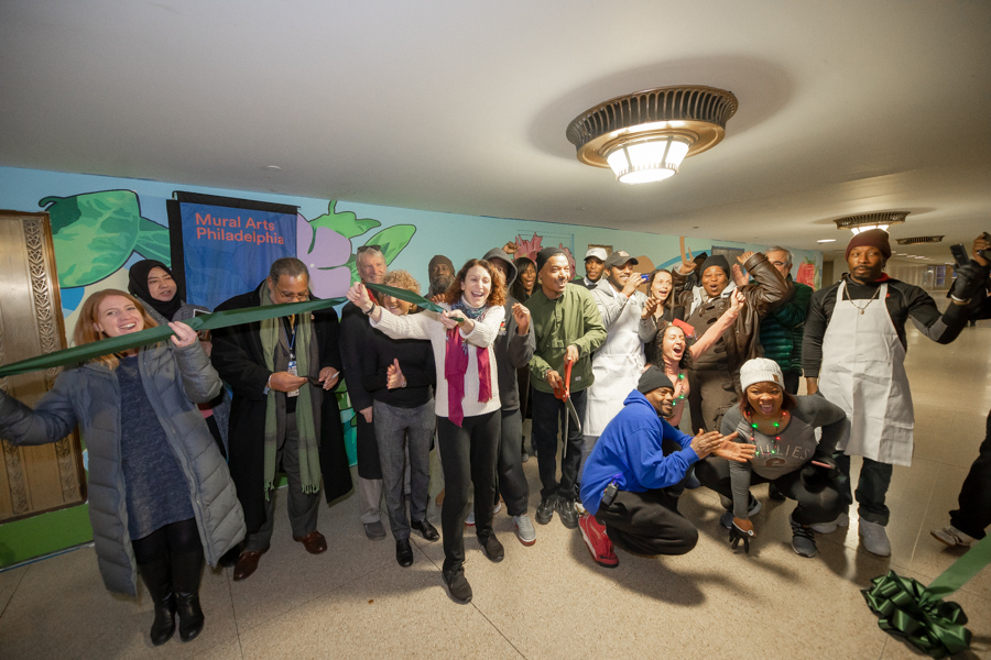 Participants were recruited from the areas surrounding Philadelphia’s Suburban Station leading to a lottery each morning in nearby Love Park. The pilot offered up to twenty people per day the opportunity to work with trained teaching artist Alvin Tull, design artist Gabe Tiberino, and outreach workers (Certified Recovery/Peer Specialists) to design and paint the mural. The first mural, in SEPTA’s Suburban Station concourse, was completed and dedicated on December 20, 2019.