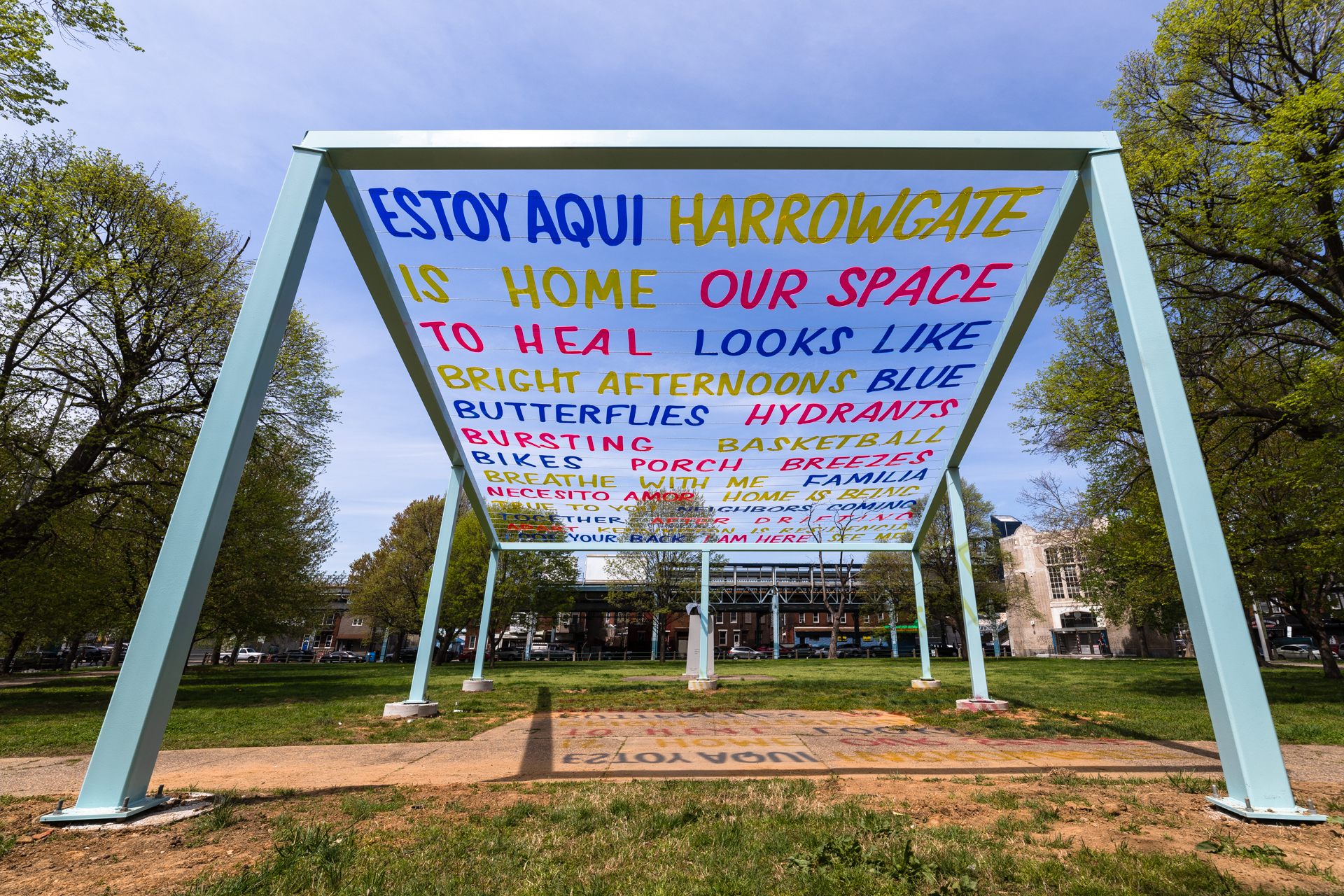 The Trust Project weaves together reflections on community life in Kensington and Harrowgate. A crowd-sourced poem captures memories, observations and thoughts on what makes these neighborhoods special. Lifted into the sky, the poem casts colorful shadows on the ground below, while encouraging Harrowgate Park visitors to look up and out from their immediate surroundings.