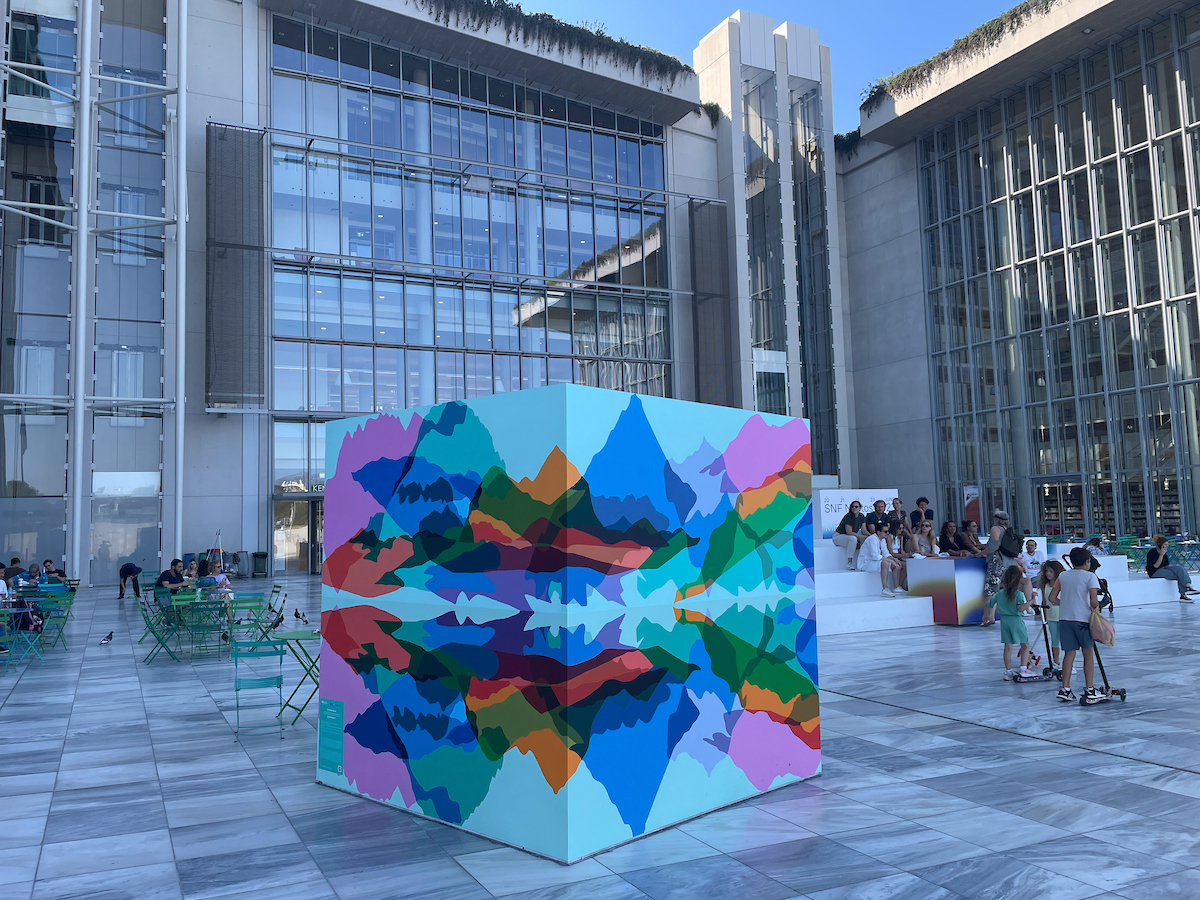 In 2023, the Porch Light team was invited to share its community-engaged mural process at the SNF Nostos Conference in Athens, Greece. The Stavros Niarchos Foundation has long been a supporter of Porch Light work. The annual conference focused on mental health, and the engagement for the mural pieces at the conference asked three questions: How would you describe your mental health in three words? What brings you down? What actions do you take to make yourself feel better mentally? Responses were gathered through a survey before the conference and by inviting in-person participation over the three days in Athens. Philadelphia artists Kien Nguyen and Athens artist Yassonas Megoulas (Cacao Rocks) designed and painted five interactive pieces on cubes. Nguyen’s designs illustrated mental health in three themes: Reflect, Connect and Heal.