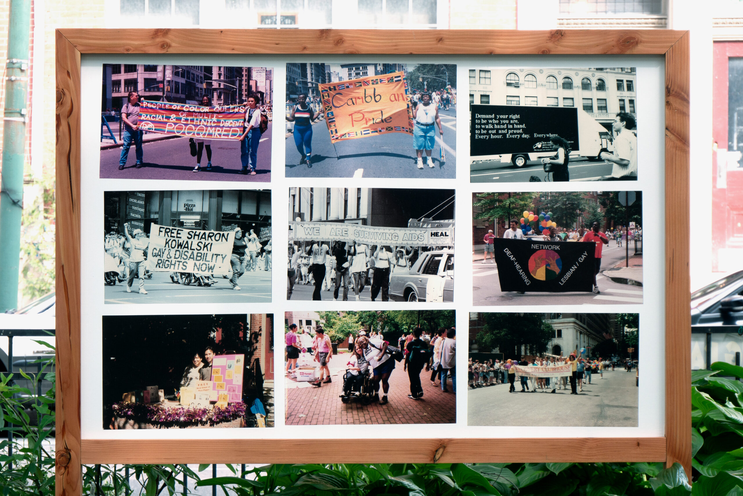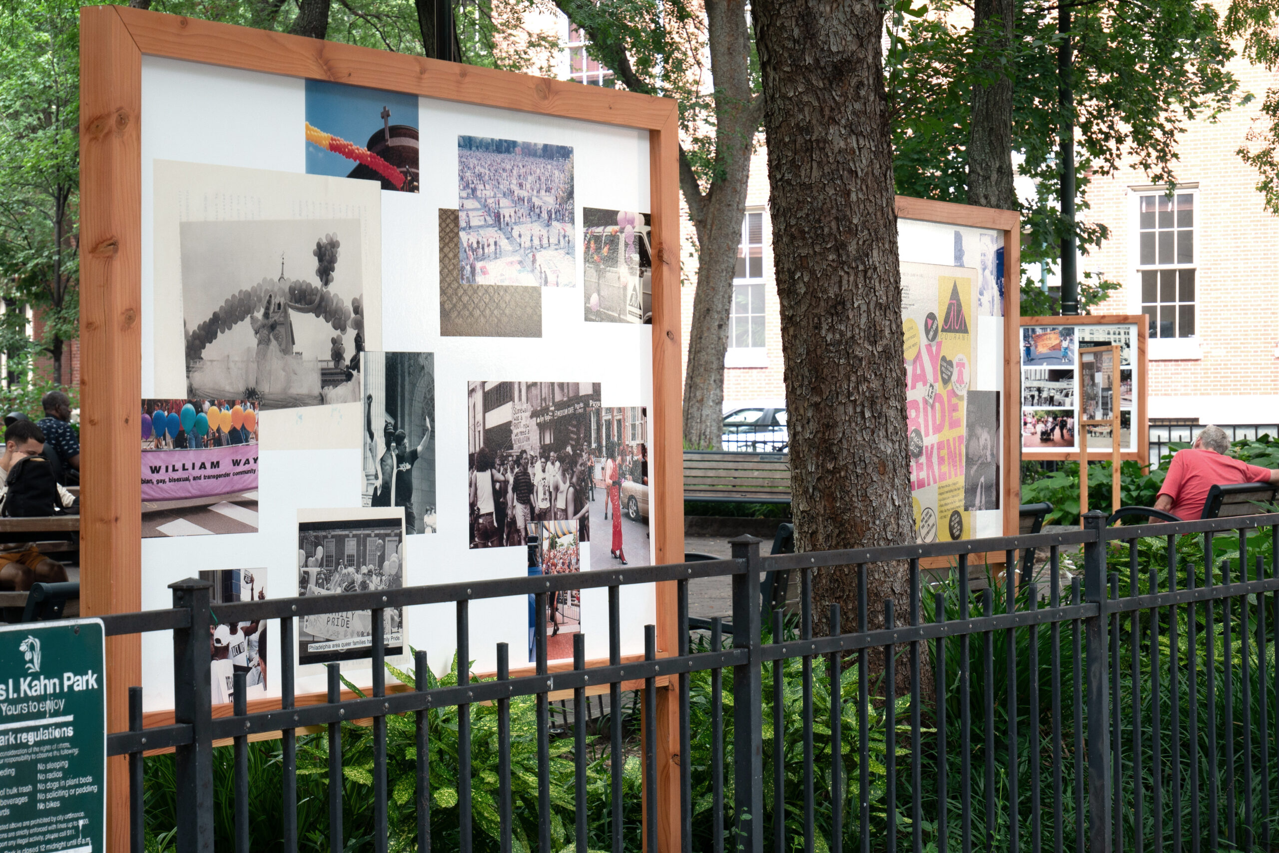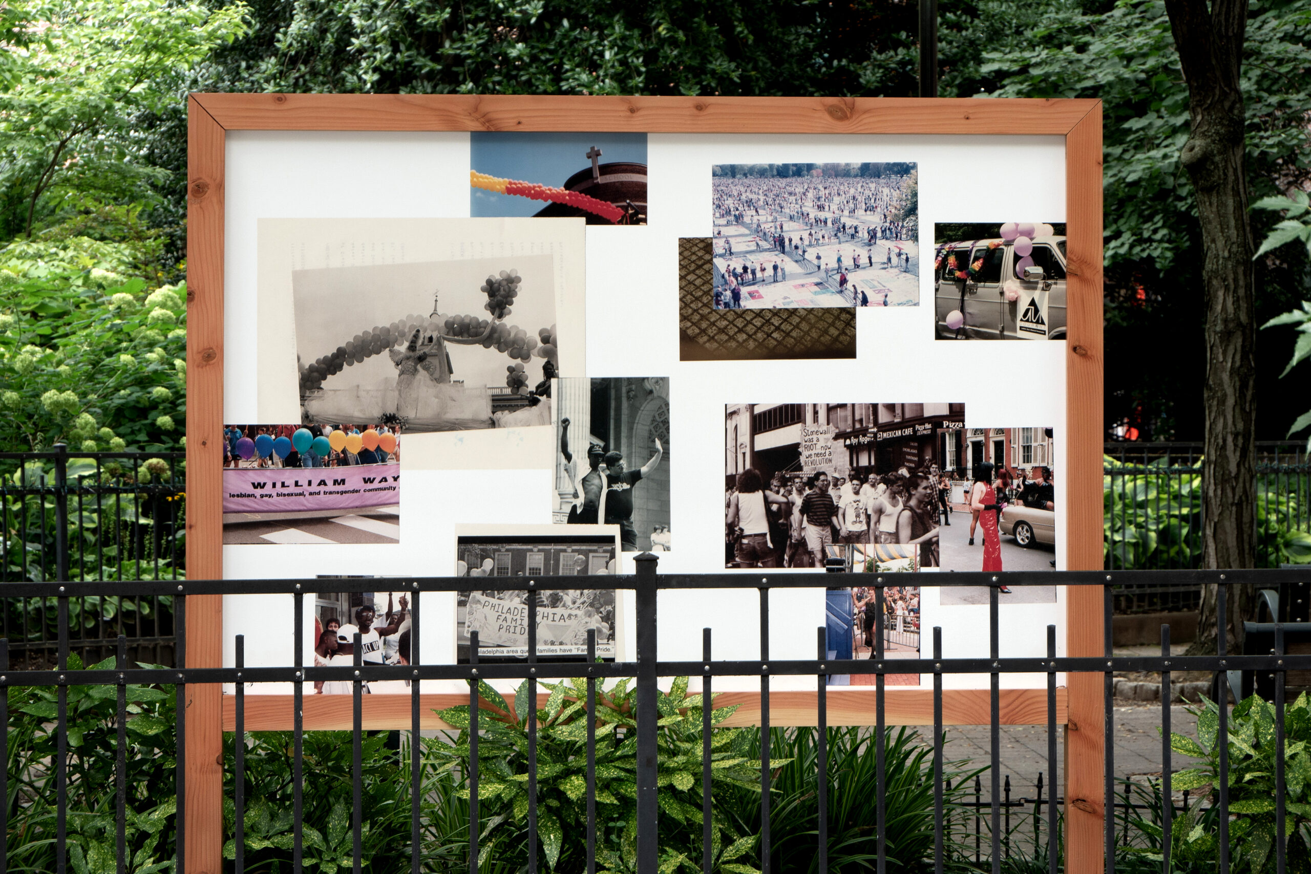 The project builds upon significant time George has spent in the John J. Wilcox, Jr. Archives at the William Way LGBT Community Center, Philadelphia’s most extensive collection of historical LGBTQ materials and ephemera. The exhibition is on view in Louis Kahn Park, the only public space in Philadelphia’s Gayborhood that has historically been a gathering place for the community. AND INTO THE STREETS opened during Pride month as a call to foreground politics in celebrating this year. Many of the political issues that emerge in this installation remain hurdles today, such as affordable housing, disability rights, and the health and well-being of trans and gender nonconforming people. Recurring individuals make appearances as well, some of whom have passed and others who remain stalwart activists and anchors in this community. There is a will for the images to speak on how the past is always with us, either in memory or in place, and how the livelihood of LGBTQ communities, in particular, relies on strong bonds forged across lines of difference and generations. Grounded in time yet still able to speak, the lingering traces in these images breathe new life into the present, coalescing a joy and politics that call us into the streets and into a world we are still becoming.