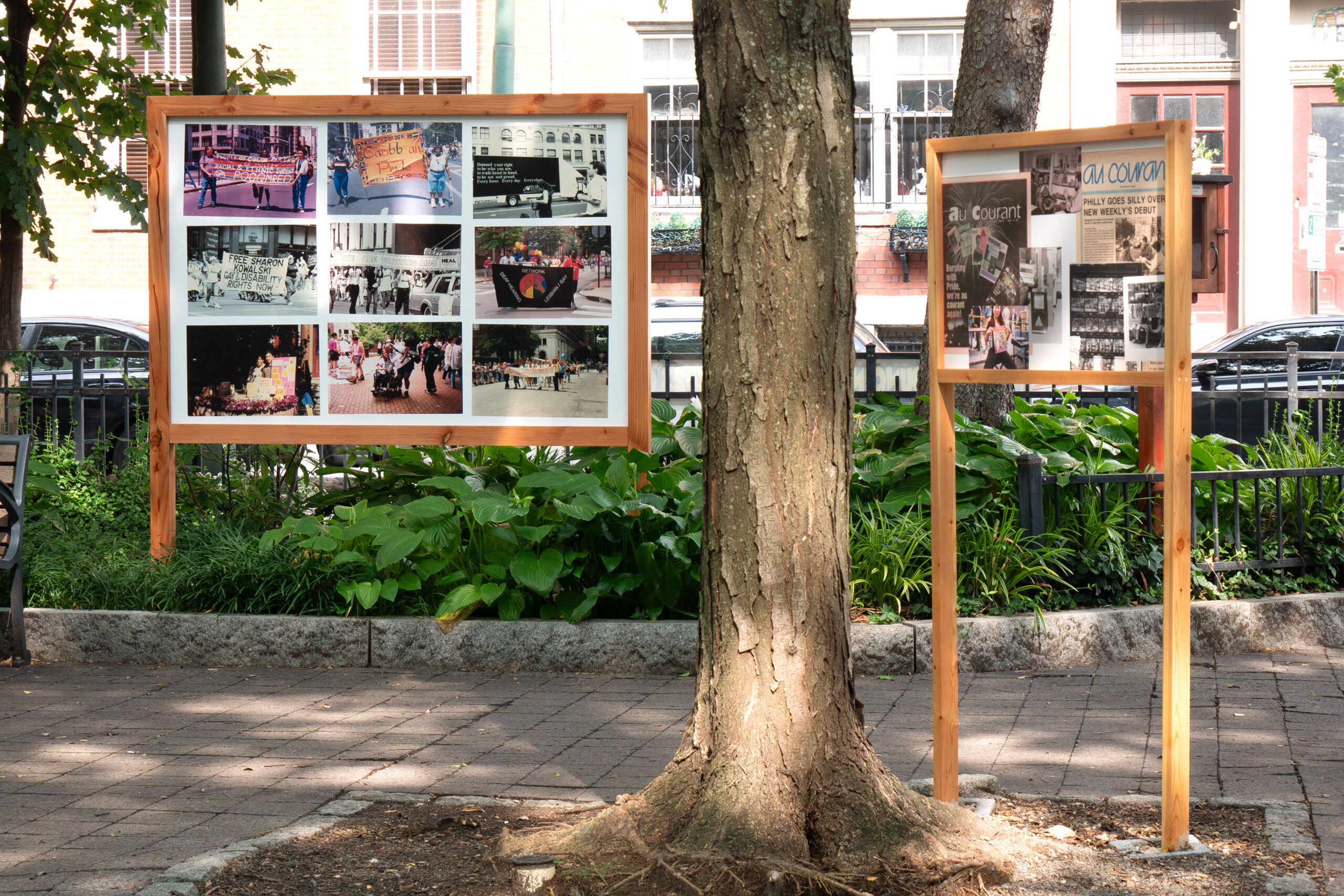 AND INTO THE STREETS is a dynamic public art project by artist Rami George that represents archival images and materials from the now defunct LGBTQ news publication, Au Courant (1982–2000). The project, which started in June, runs through October 2023. George threads together photographs of underrepresented histories and voices that depict a queer cultural memory of Philadelphia life, many of which were never published. Displays of public and private intimacies, political protests, and joyful celebrations are arranged nonlinearly, opening the potential for new resonances to emerge as the images leave the solitude of the archives and gain new life in the streets. The result is a complex portrait that foregrounds not just LGBTQ life but, more importantly, its intersections with many other hopes and struggles for a world built on care and solidarity.