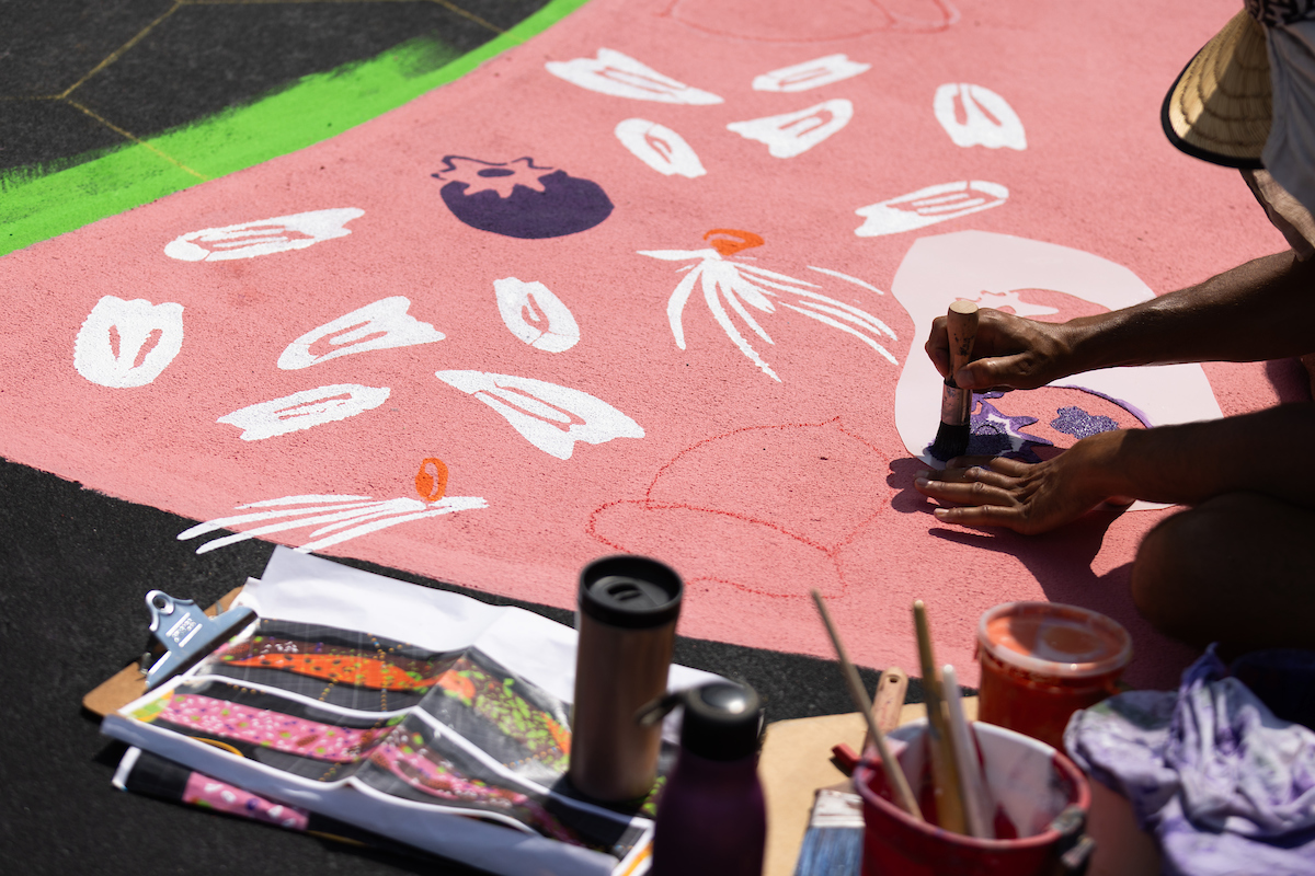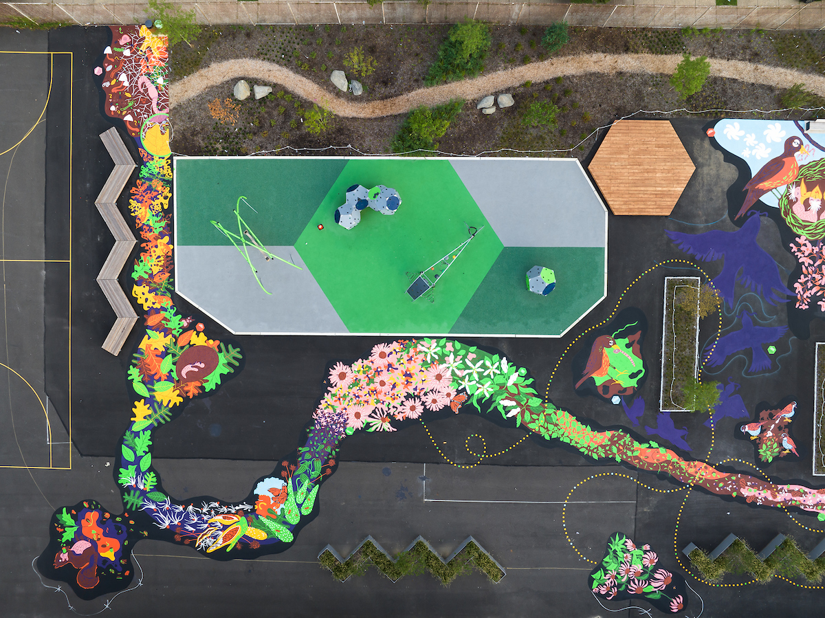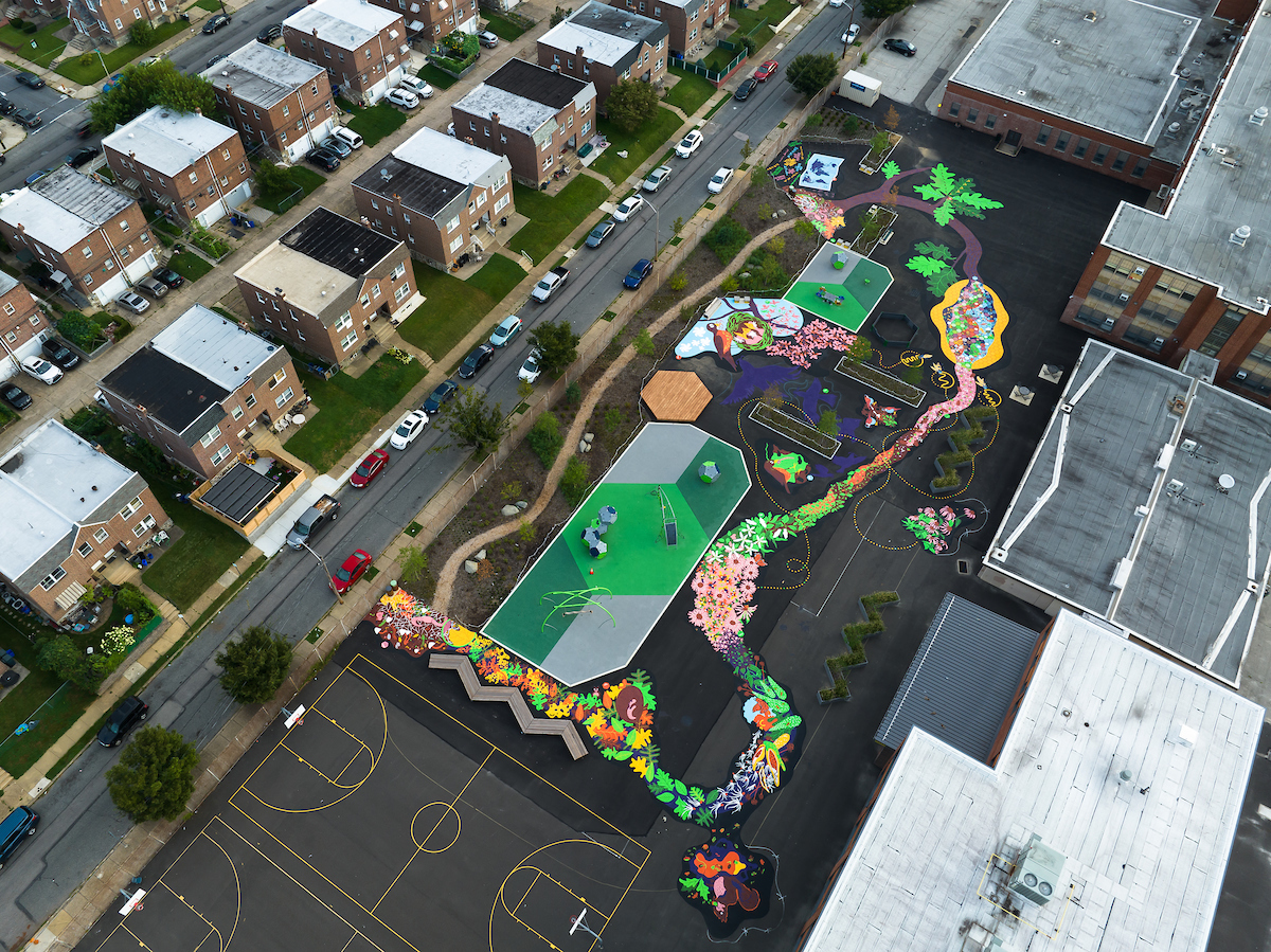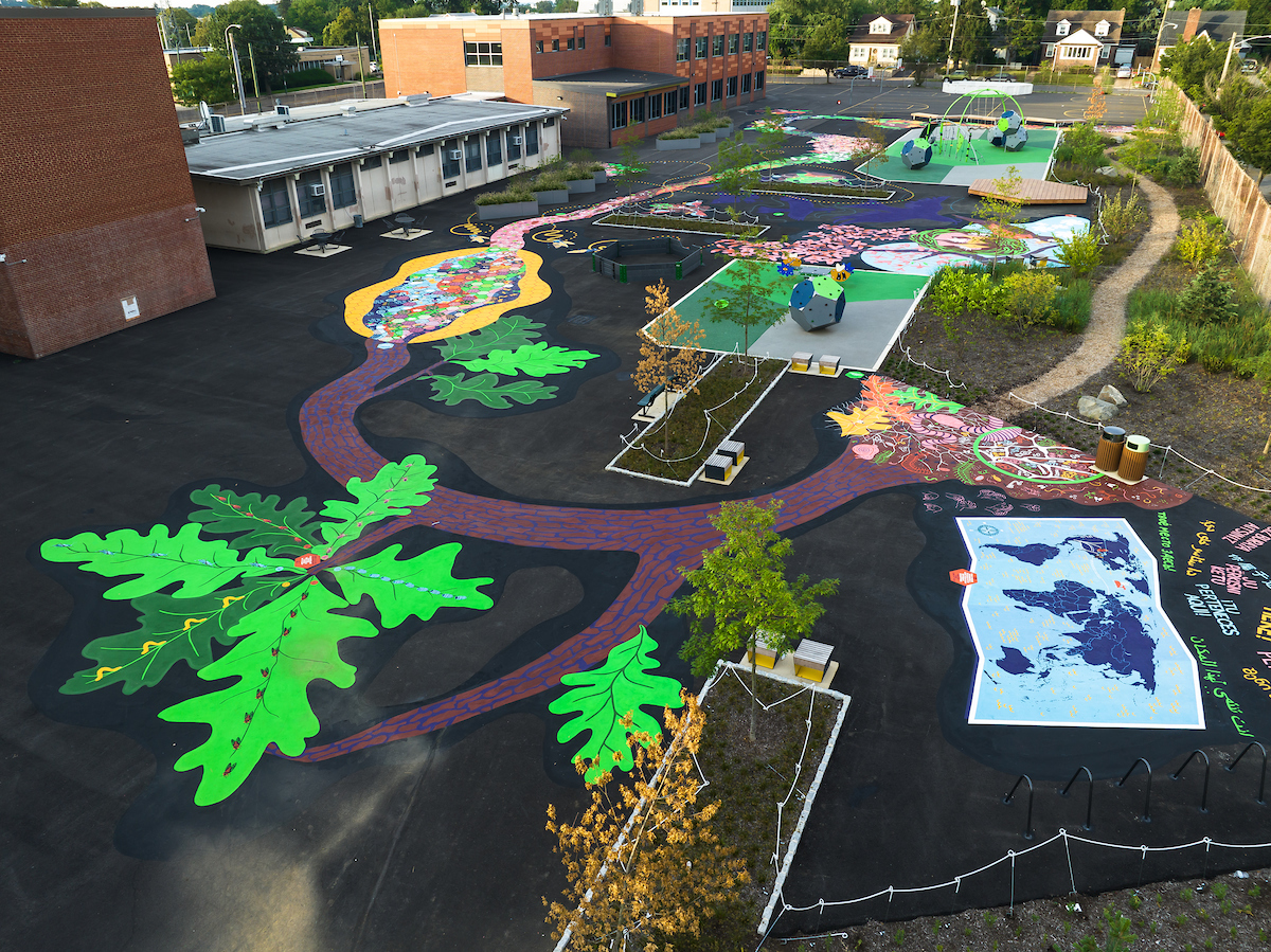 The Literacy Loop ground mural is just one component of Farrell: A Place That’s Alive, a community gameplaying, storytelling, and design initiative that since 2019 has resulted in the overall transformation of Farrell’s schoolyard, including the introduction of greening, landscaping, new play equipment, and additional gathering spaces for the school’s students and the neighboring community’s youth.