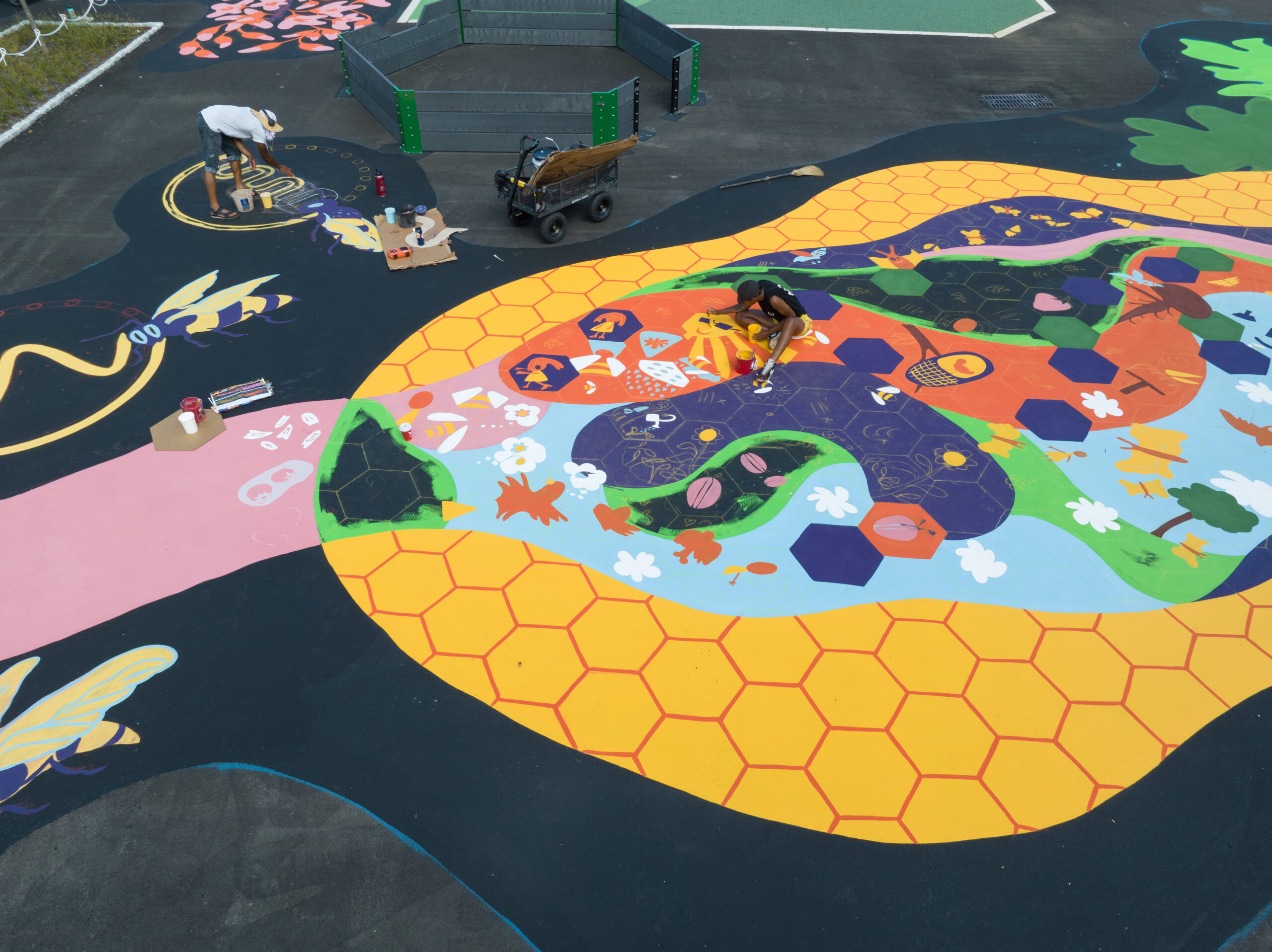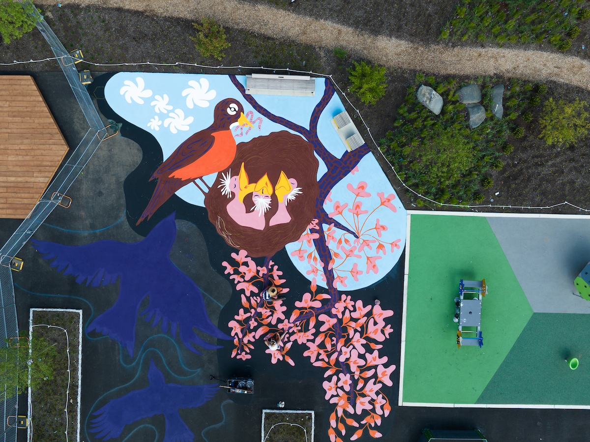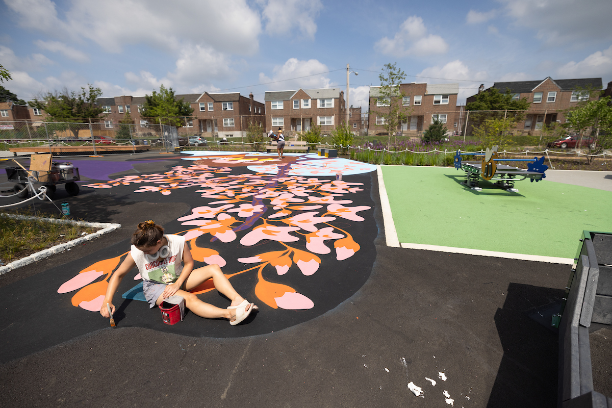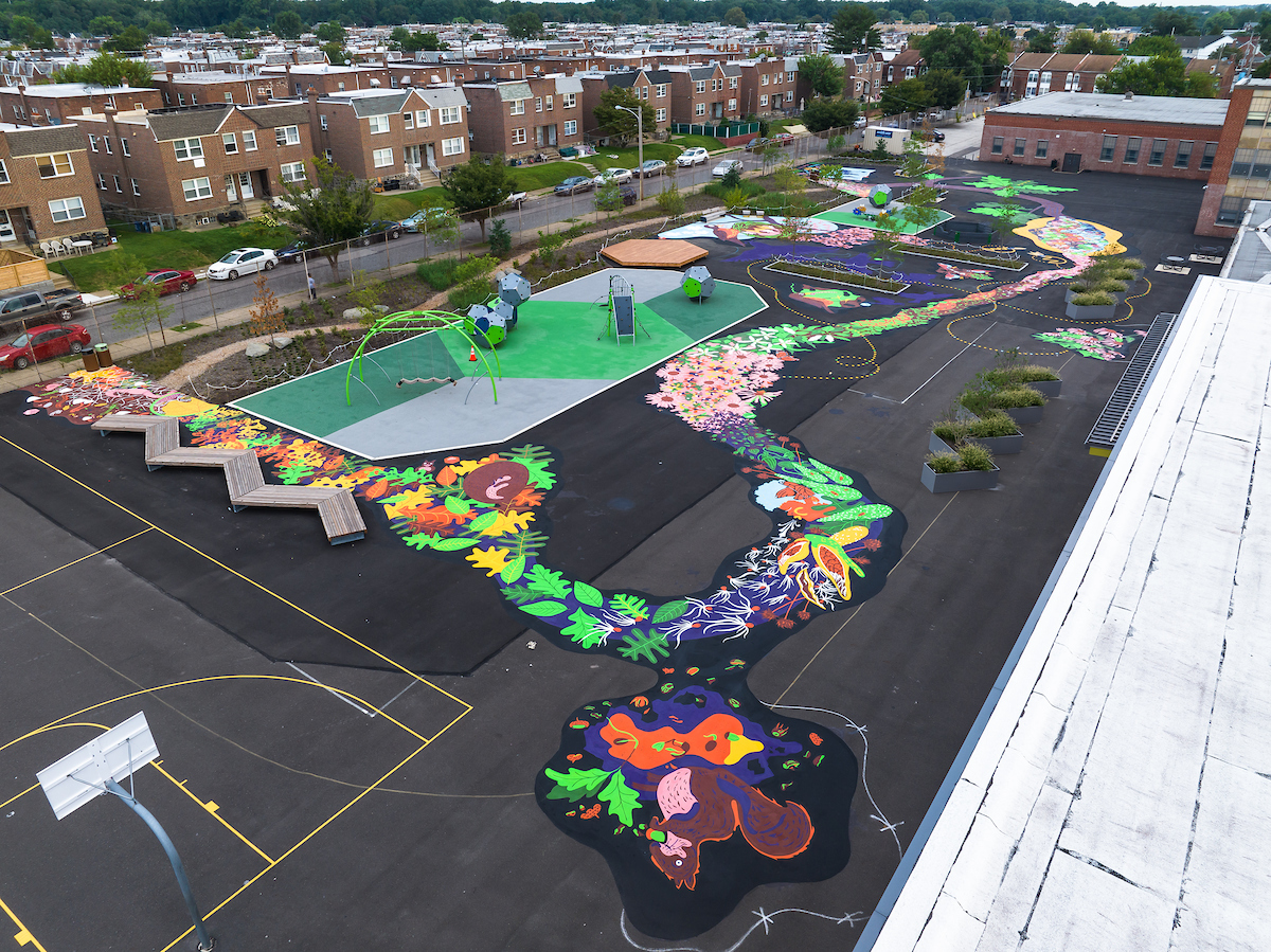 This 10,000 square foot ground mural designed and produced by Philadelphia-based artists Jason Killinger and Jenna Robb is intended to support guided play, storytelling, and conversation focused on the development of the Playful Learning Schoolyard’s 6C learning goals for children — communication, collaboration, creative innovation, critical thinking, and confidence building.