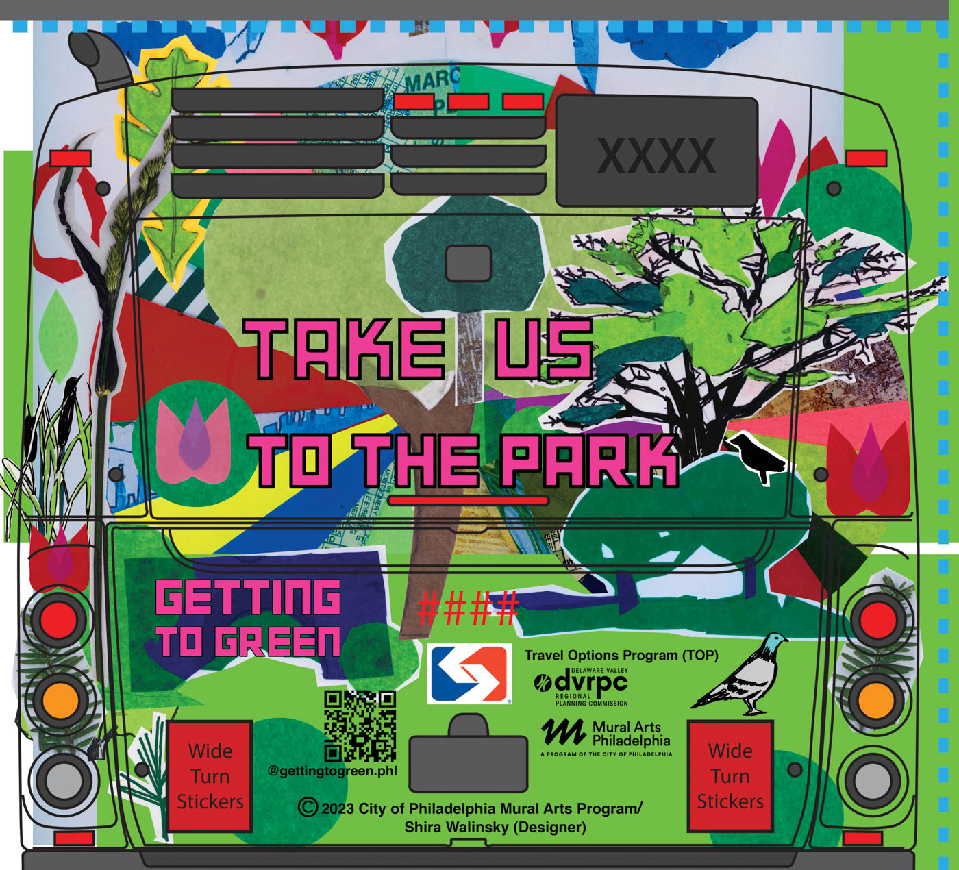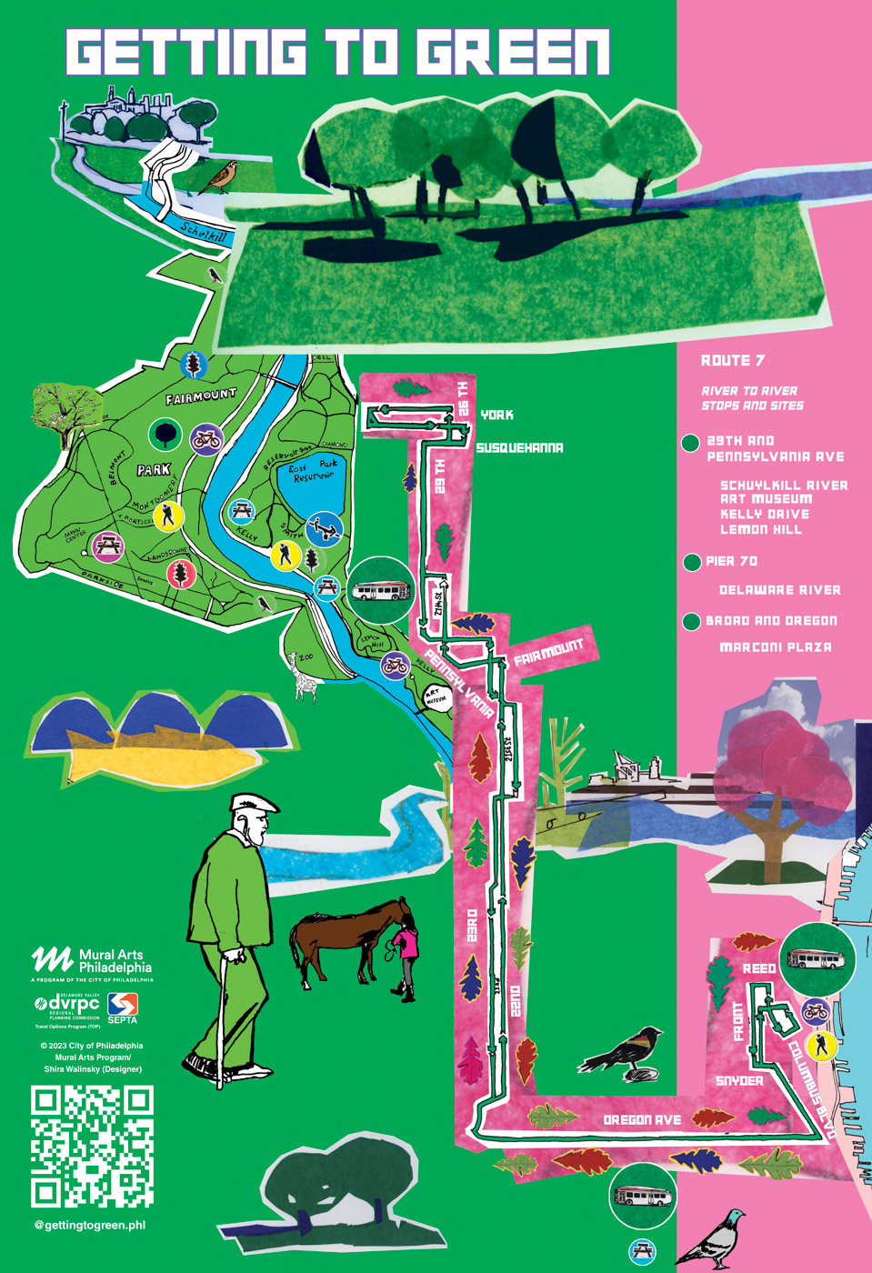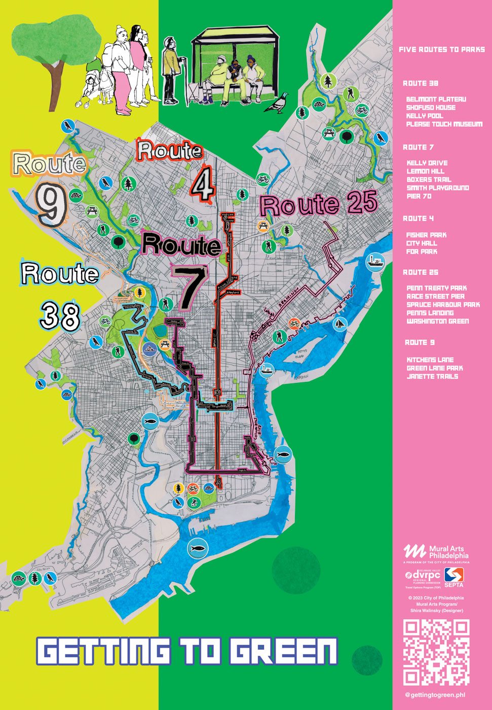 Getting to Green: Routes to Roots is a multi-disciplinary public art project in Philadelphia that encourages residents to explore the city’s green spaces through public transit, promoting the discovery and rediscovery of these areas along how to access them. The artist team of Shira Walinsky and Laura Deutch is guiding this initiative, creatively forging connections between urban dwellers and the city’s natural gems. Walinsky’s unique visual artworks are used to inspire and activate riders, including a captivating bus wrap, eye-catching posters in bus shelters, and hand-drawn printed maps. Two chartered bus rides and four smaller trips constituted adventures on the 38, 64, 7, and 9 bus routes. Deutch’s video profiles document the experiences of diverse riders along the routes in tandem with Walinsky’s visuals as a backdrop to these compelling narratives.
