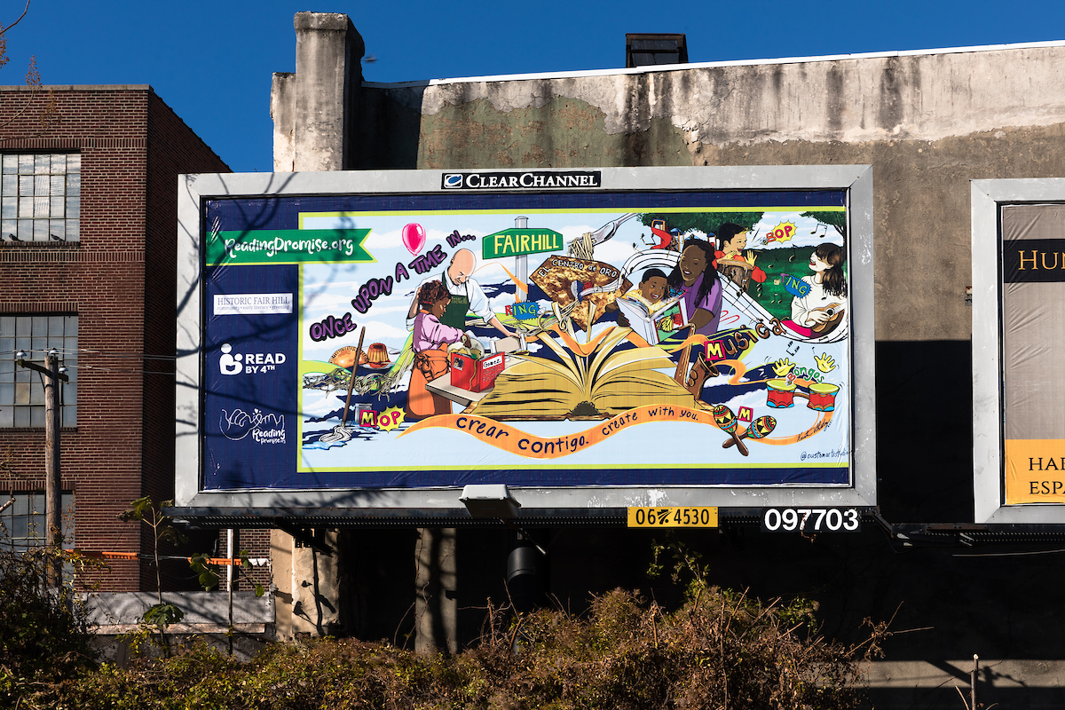 We Will Write the World Project is centered on increasing childhood literacy by encouraging playful learning through public art, billboards and murals. This project encourages dialogue and interactions between grown-ups and children through large-scale public art pieces in the Literacy-Rich Neighborhoods of Fairhill, Germantown, Logan, and South Philadelphia.