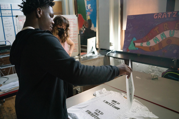 In the second phase, Phoebe Bachman and Akeil Robertson hosted a series of teach-ins about the 13th Amendment in DC, Florida, Louisiana, and California, and Pennsylvania. During these teach-ins they collected additional input from those who are impacted by state violence, weaving in their narratives of how the exception in the 13th amendment has impacted not only those inside but their families and entire communities. Participants walked away with hand-stenciled t-shirts and bags advocating for change.
